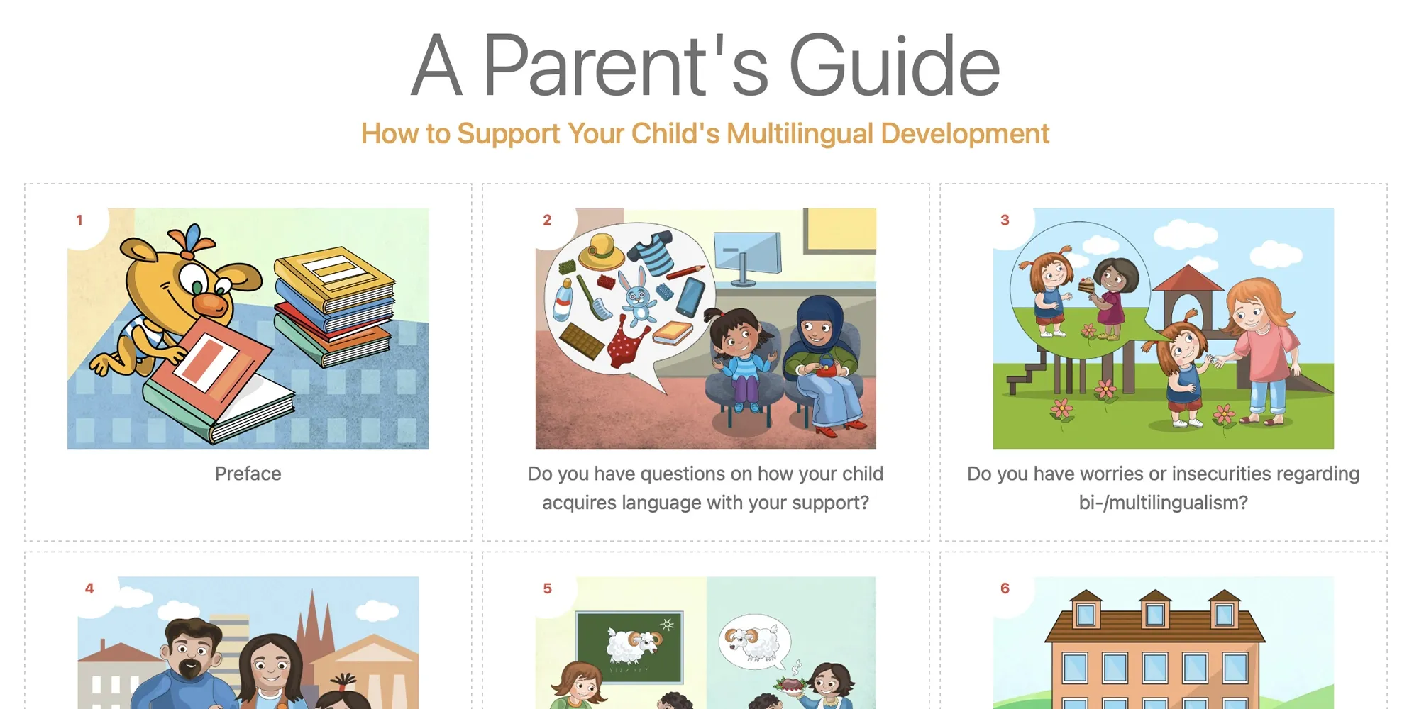 Ein zentrales Ergebnis für Eltern ist das Handbuch Mehrsprachigkeit bei Kindern unterstützen: Ein Ratgeber für Eltern. Der 50-seitige Leitfaden wurde ursprünglich auf Englisch entwickelt, in neun Kapitel gegliedert und anschließend in denselben Sprachversionen wie die Plattform verfügbar gemacht.