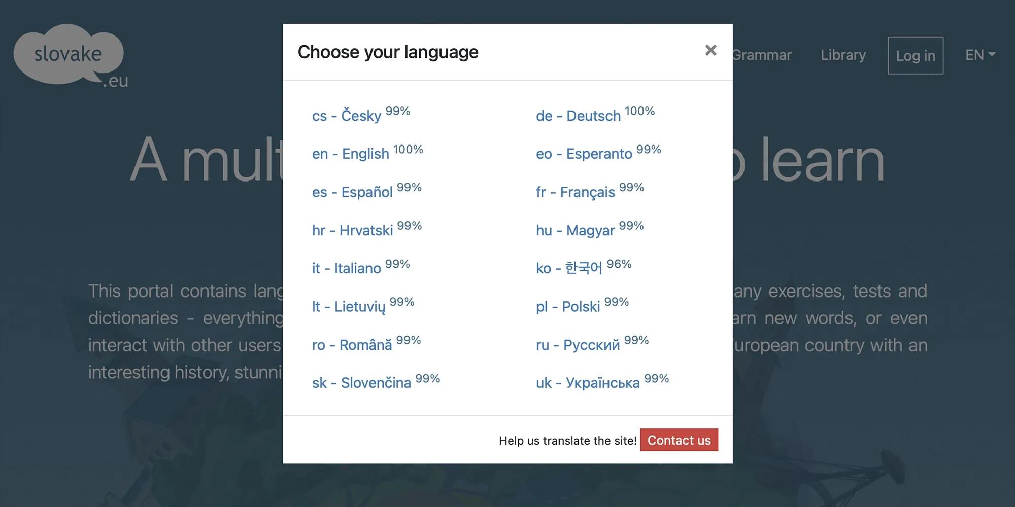 Heute ist slovake.eu in sechzehn Oberflächensprachen verfügbar, darunter Ukrainisch, was den Bedürfnissen neuer Lerngruppen entspricht. Dieser mehrsprachige Zugang senkt Einstiegshürden und ermöglicht es Nutzerinnen und Nutzern, Slowakisch zu lernen, während sie sich auf der Plattform in ihrer eigenen Sprache orientieren.